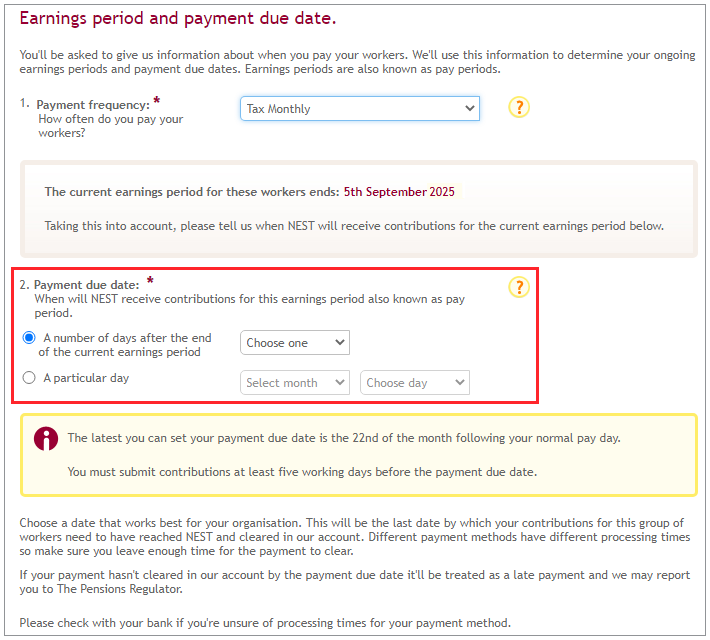 When adding a new group choose the payment frequency ‘Tax Monthly’ under Earnings period and payment due date.