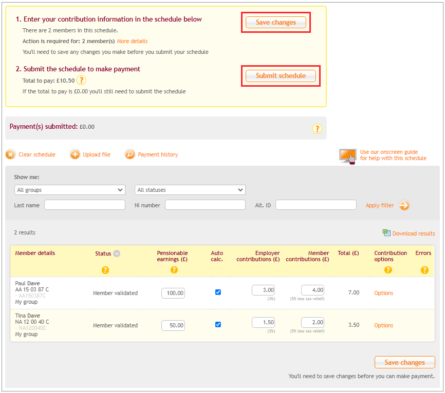 Once you’ve entered the contribution details, click ‘Save changes’. Then click ‘Submit schedule’ to process the payment.