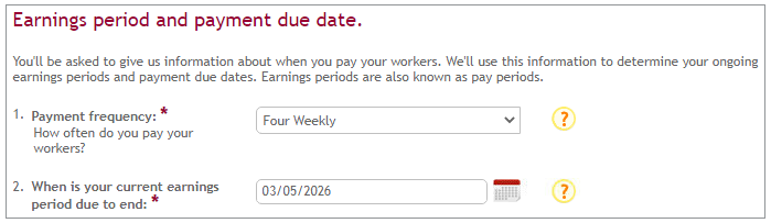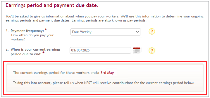 Once you’ve told us which contribution rates you’d like to use, we’ll ask you to set up an earnings period also known as a pay period by selecting a payment frequency.