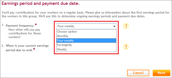 When adding a new group choose the payment frequency ‘Four weekly’ under Earnings period and payment due date.